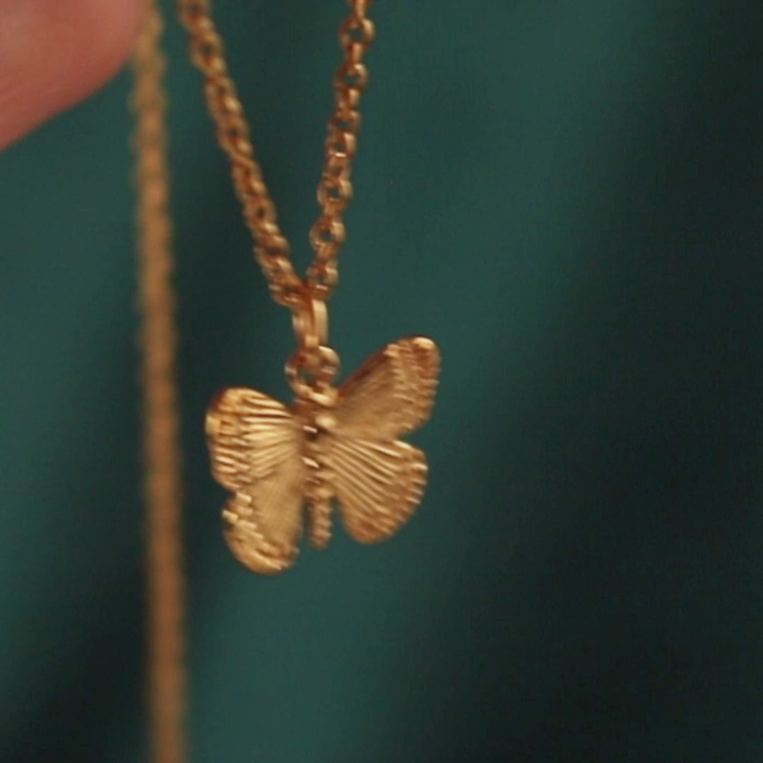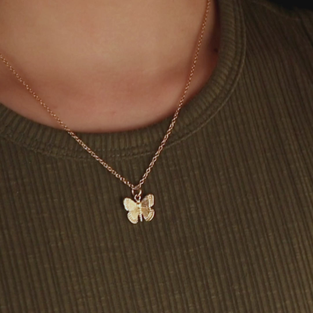 This magical gold butterfly pendant necklace is perfect for layering with other necklaces, with its delicate cable chain threaded through the small ring bail on the top. A lobster clasp keeps this feminine necklace secure, making it effortless to place on and remove. Finish your look with this butterfly pendant, adding an eye-catching look to your casual, night, or work attire.
