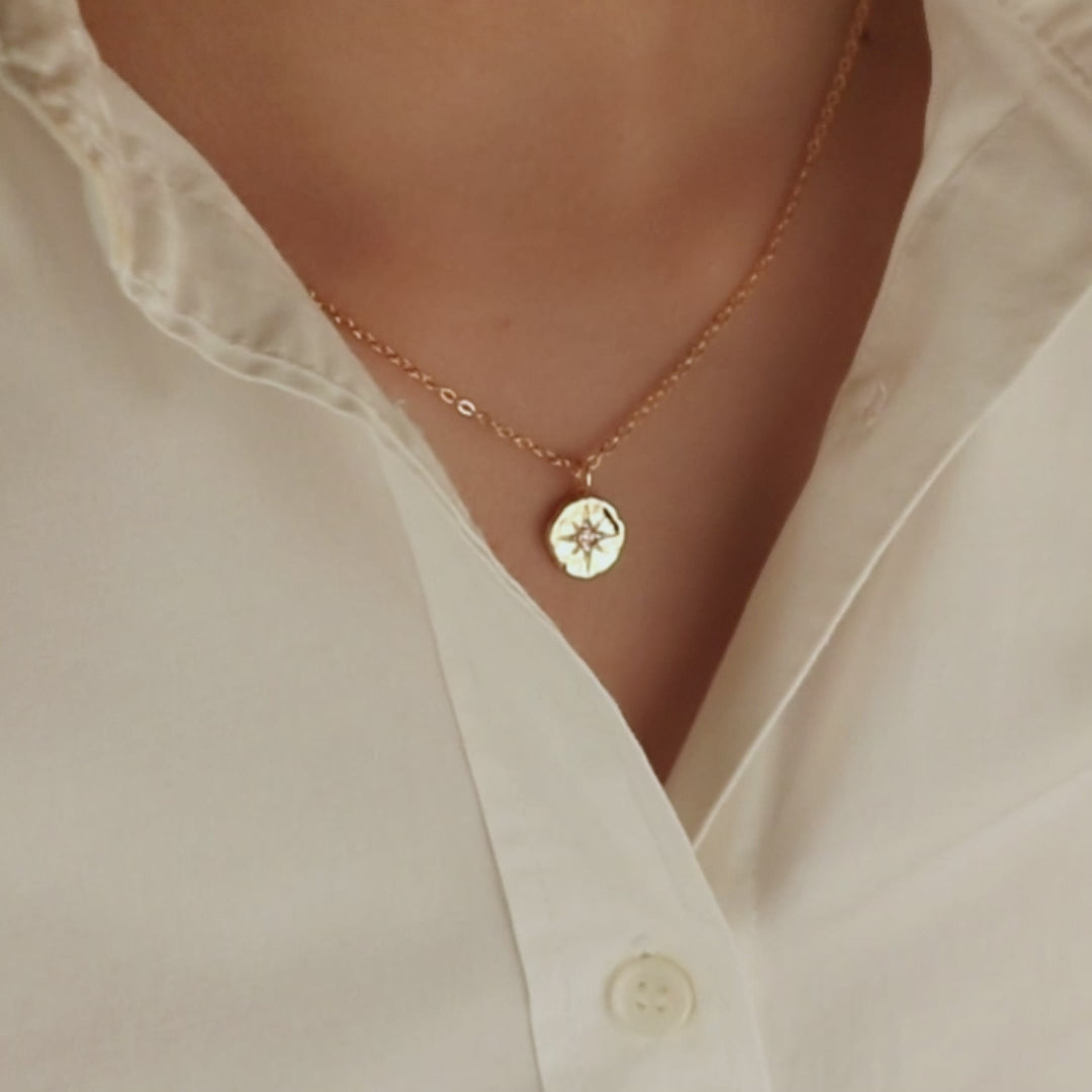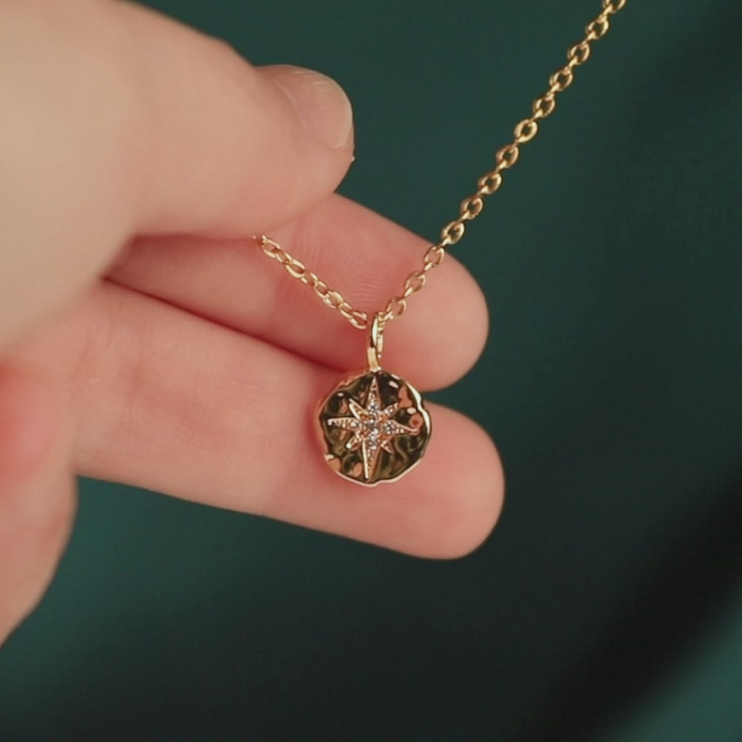 Add luck and luxury to your layering necklace collection with this brightly polished pendant necklace, sparkling with crystals encrusted in a hammered textured pendant with an engraved 8-pointed star. A delicate cable chain threaded through the small ring bail on the top finishes the look, all crafted in durable 18k yellow gold-plated stainless steel, making this delicate necklace perfect for wearing daily.