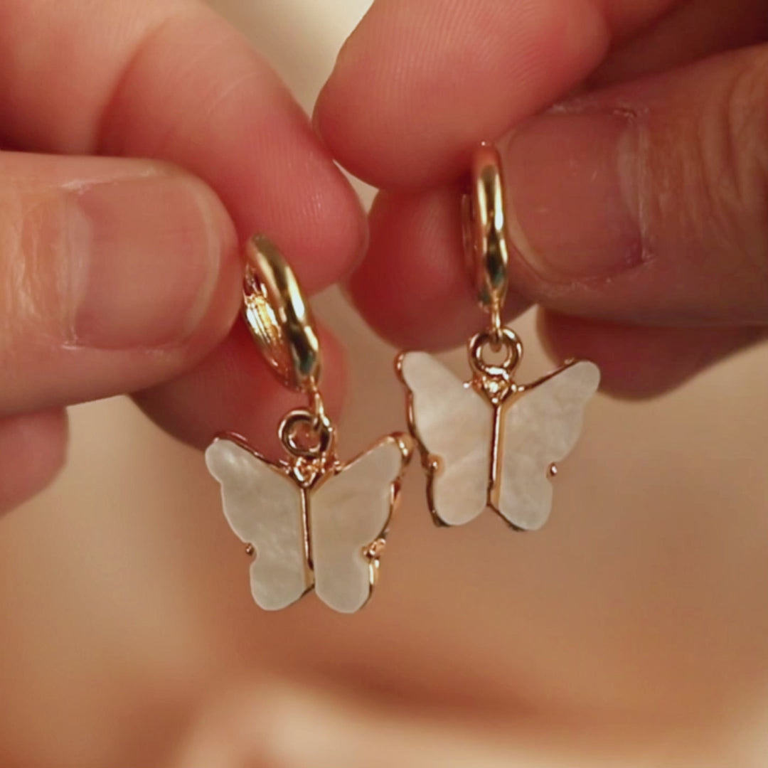 Meaningful; butterflies symbolize growth and change, bringing joy and happiness into the world with their fluttering. Gift these feminine butterfly dangle huggie hoop earrings into your Ear Party look, or wear them on their own.