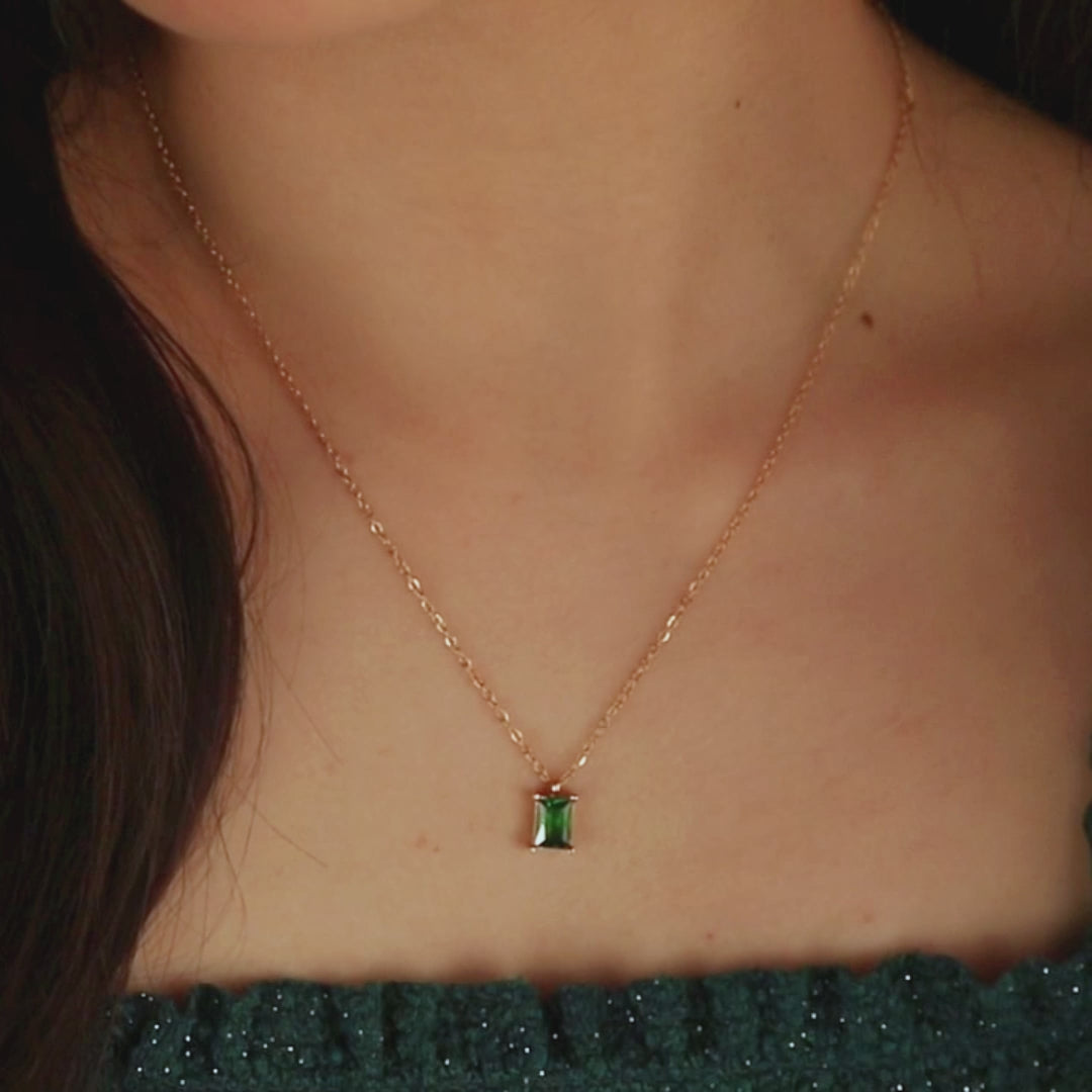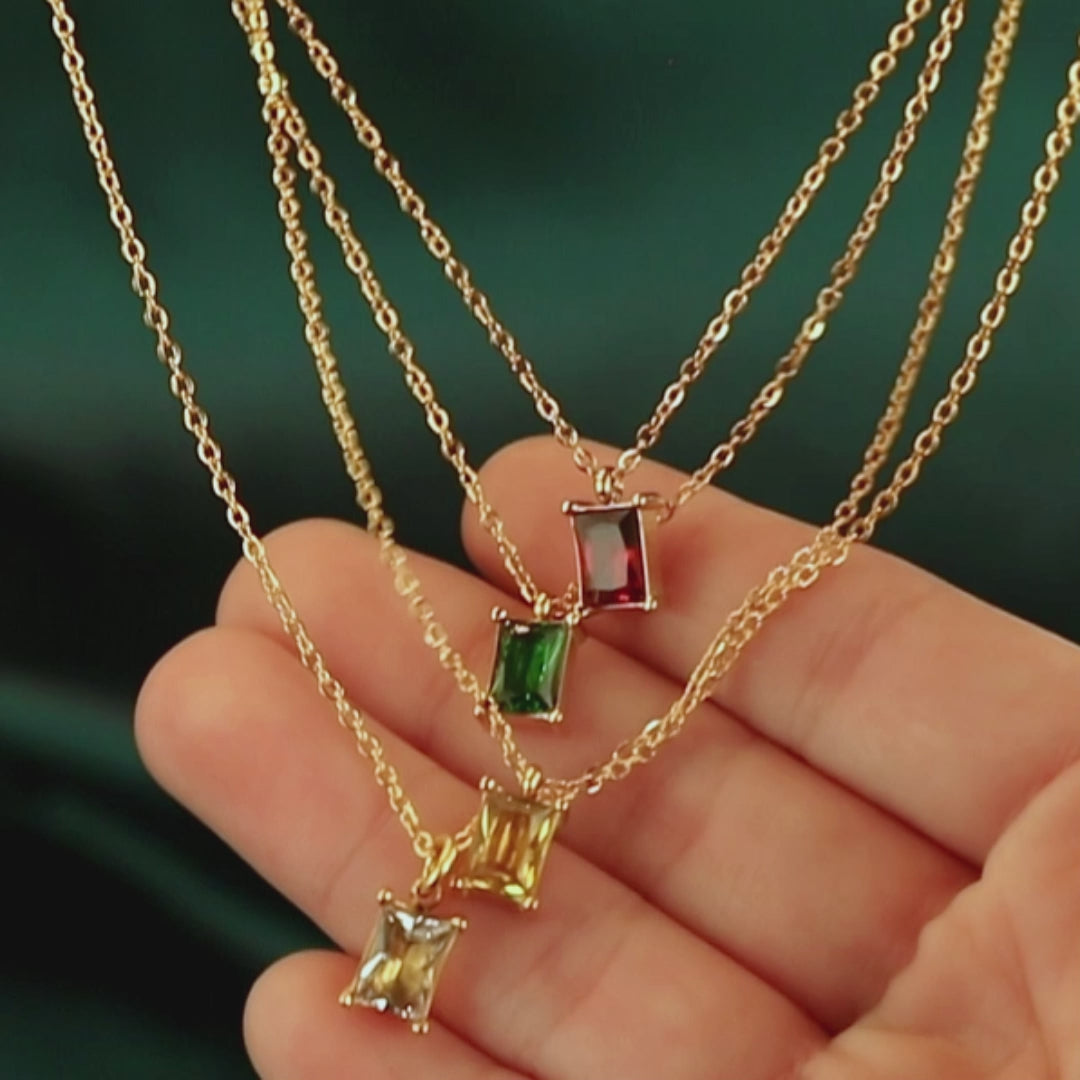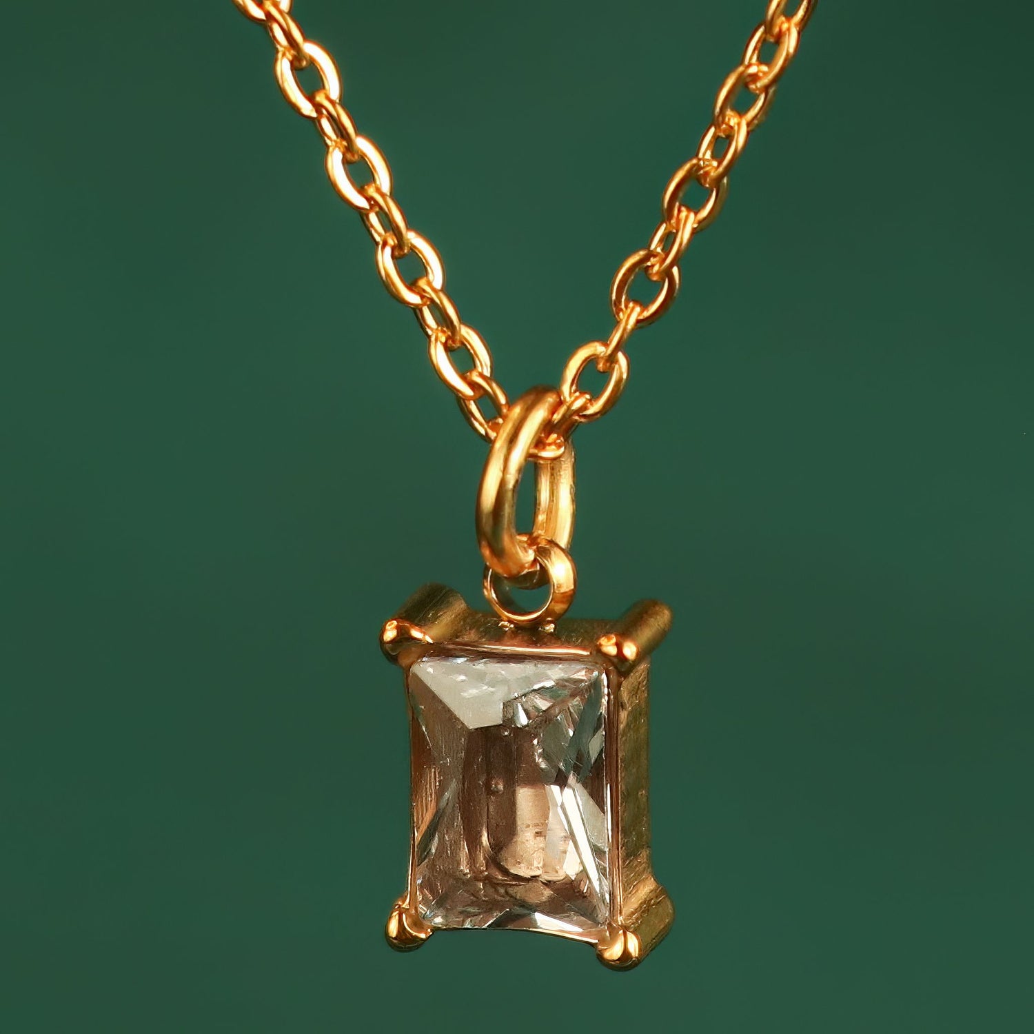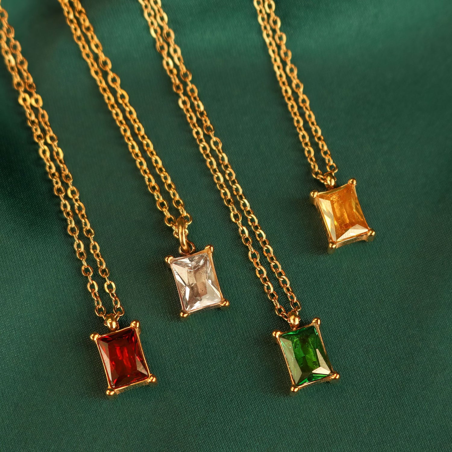 This high-quality 18k yellow gold-plated stainless-steel baguette pendant necklace features a vibrant radiant cut cubic zirconia secured in a four-prong basket setting. A delicate cable chain suspends this pretty pendant with a small bail on the top, making it ready for wear or gifting to any loved one. Created with high-quality cubic zirconia in rich, saturated color.