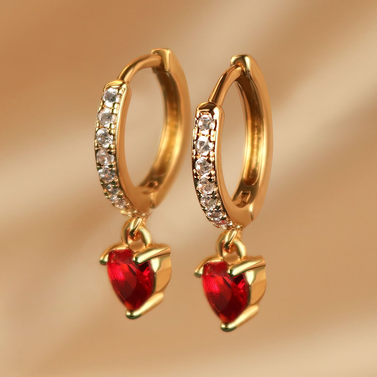 Allow these lightweight 18k yellow gold plated huggie hoop earrings to become a part of your day or night outfit, finely crafted in brightly polished 18k yellow gold plating for a luxe appeal. Vibrant cherry red high-quality cubic zirconia solitaire stones in a droplet design suspended from the cubic zirconia-studded huggie hoop earrings. Curved posts with hinges on the bottom create ease when placing on and removing from the ears, making these gold hoops your favorite go-to for a feminine and elegant look.