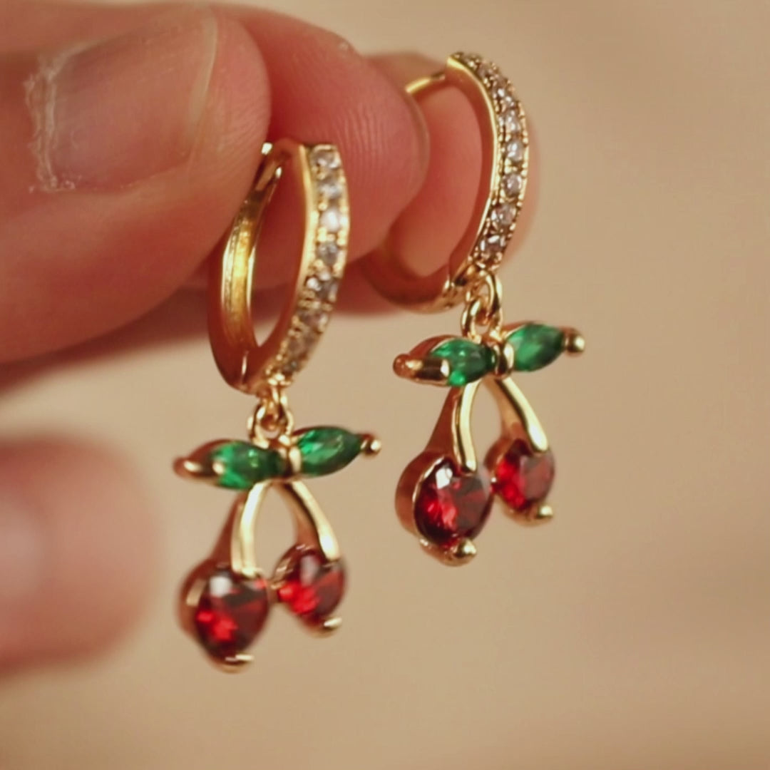 These super-sweet cherry drop huggie hoops can go everywhere you do with their delicious design in rich, saturated color. Enjoy a trip to the mall, work, a casual night out, or a picture-perfect moment with these delectable dangle earrings. These small gold hoops have hinges on the bottom and curved posts, providing a comfortable infinity fit.